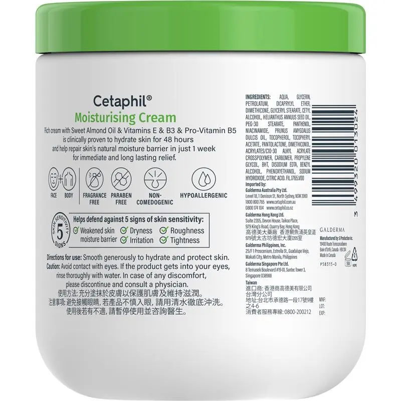 Cetaphil Moisturising Cream intensely hydrates for 48 hours to help restore your skin’s moisture barrier. Enriched with Sweet Almond Oil and Vitamin E, this rich and nourishing moisturiser is ideal for dry to very dry, sensitive skin.