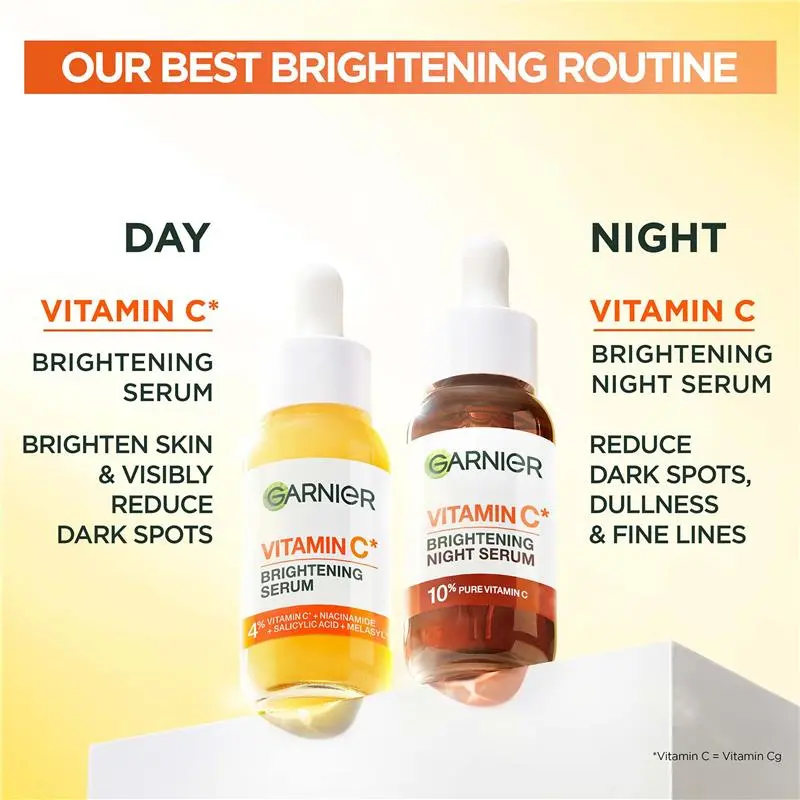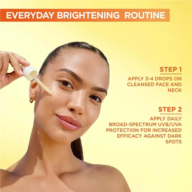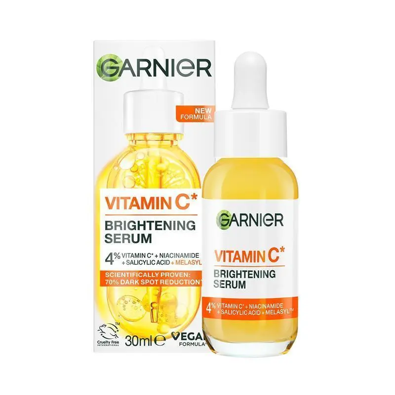 Your favourite Vitamin C* Brightening Serum is better than ever! Formulated with 4% [ VITAMIN C* + NIACINAMIDE + SALICYLIC ACID + MELASYLTM] for brighter skin in 3 days. A lightweight, non-sticky, fast absorbed formula, proven to even skin and reduce all types of dark spots. Our serum combines the power of Vitamin C* a powerful antioxidant to brighten skin, Niacinamide a soothing active proven to even skin tone, Salicylic Acid to gently exfloiate to promote skin cell turnover and patented MelasylTM a new active prove to reduce dark spots and what naturally gives this formula it’s yellow hue. SCIENTIFICALLY PROVEN: In 3 days: skin is brigher** In 8 weeks: -70% dark spot reduction*** Tested on all types of dark spots, even stubborn: post acne marks, sun and age spots for visible dark spot reduction. Garnier commits to greener beauty: This product is tested dermatologically, Vegan Formula^, Cruelty-Free approved. *Vitamin Cg **Cosmeto-clinical study, 111 subjects, after 3 days of twice daily application ***Cosmeto-clinical study, 111 subjects, after 8 weeks of twice daily application ^No animal derived ingredients or by-products.