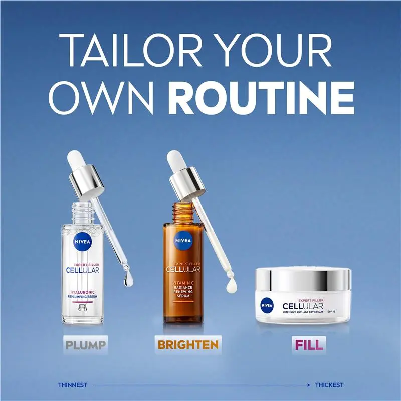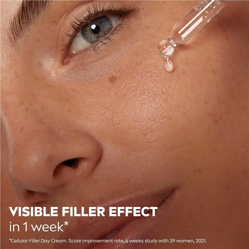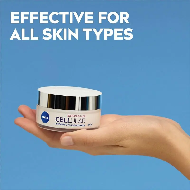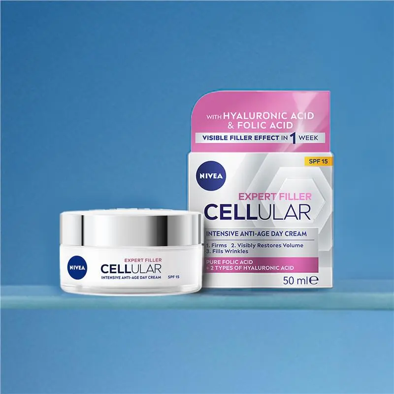 NIVEA Cellular Expert Filler Day Cream’s advanced formula combines powerful anti-ageing actives for a visible filler effect in just 1 week-firming skin, restoring volume, and filling wrinkles. SPF15 UVA/UVB protection helps shield skin from UV-induced ageing and cell damage.