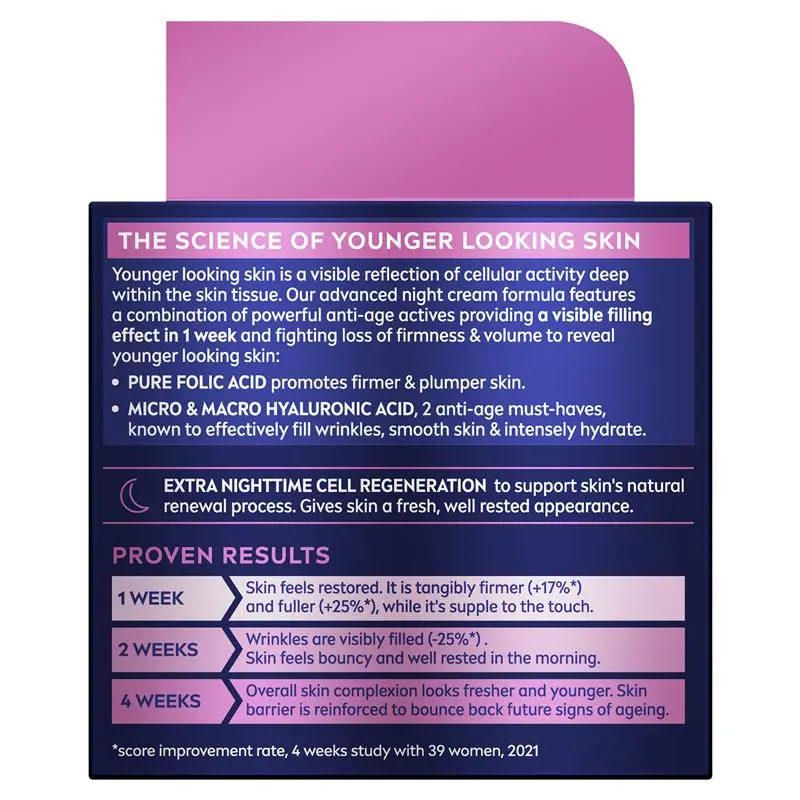 Anti-ageing night cream with hyaluronic acid to help fill and smooth wrinkles overnight.