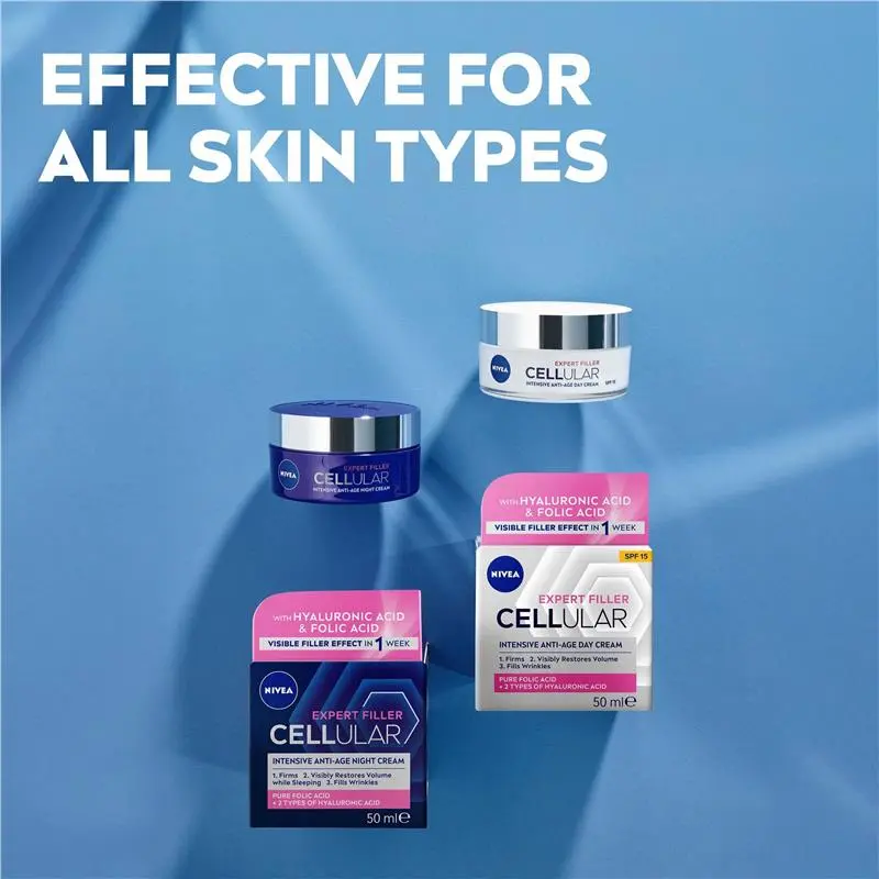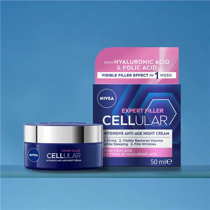 NIVEA Cellular Expert Filler Night Cream with its innovative formula features a combination of powerful anti-age actives providing visible filler effect in 1 week and fighting loss of firmness and volume to reveal younger looking skin. Made with Hyaluronic Acid and Folic Acid, the night cream works to firm, fill wrinkles and visibly restore volume to the skin. This night cream works whilst you are sleeping, when your skin is at its most receptive, to support your skin’s natural renewal process giving your skin a fresh and well rested appearance. The skin compatibility of this night cream has been dermatologically approved.