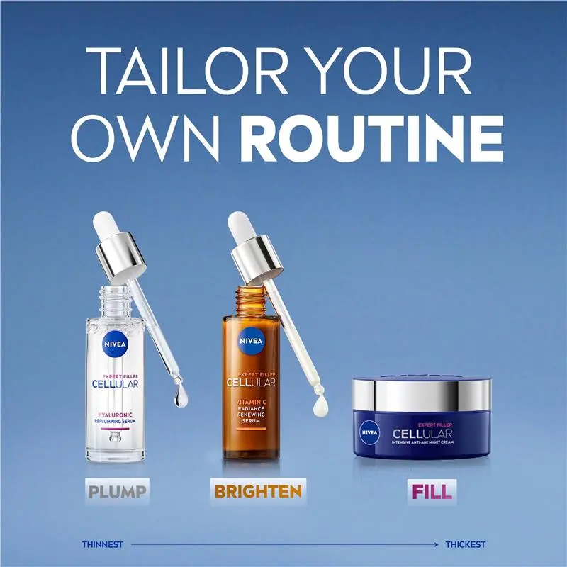 NIVEA Cellular Expert Filler Night Cream’s advanced formula features a combination of powerful anti-age actives providing a visible filler effect in 1 week to firm, restore volume and fill wrinkles. Working through the night, when your skin is at its most receptive, the cream helps refine your skin.