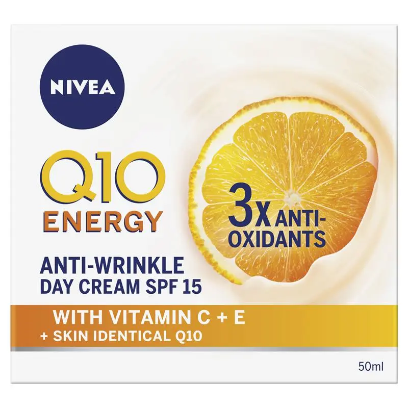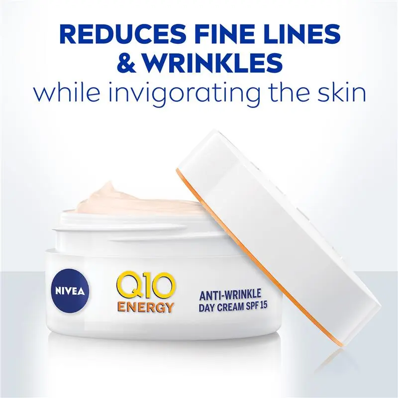 With its combination of Q10 and Vitamin C, NIVEA Q10 Energy Anti-Wrinkle Day Cream SPF15 recharges dull, tired skin and immediately invigorates for greater freshness and visibly smoother skin. This cream effectively refreshes the skin and reduces signs of fatigue.
