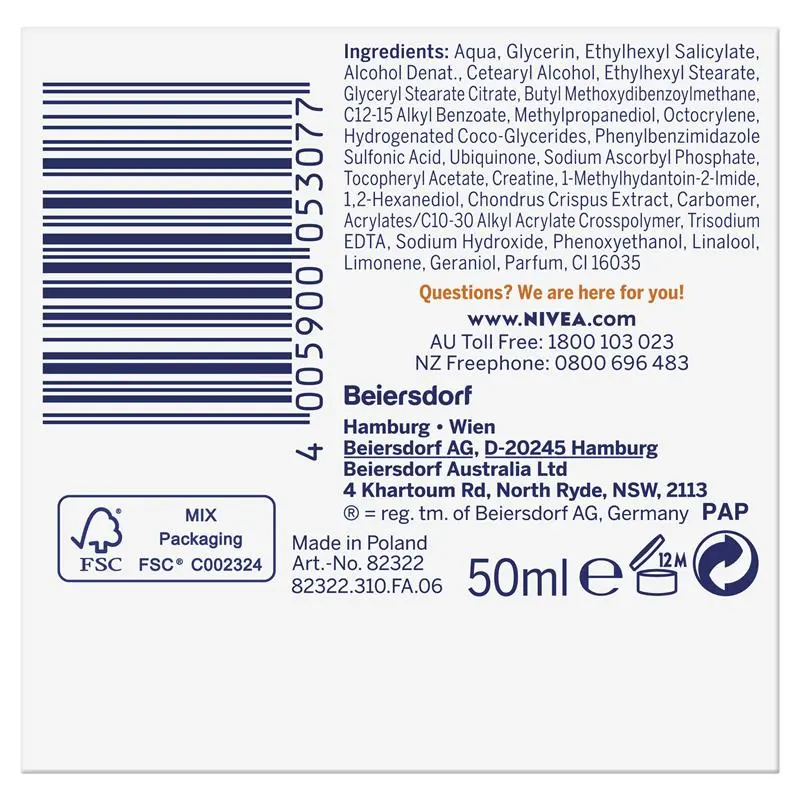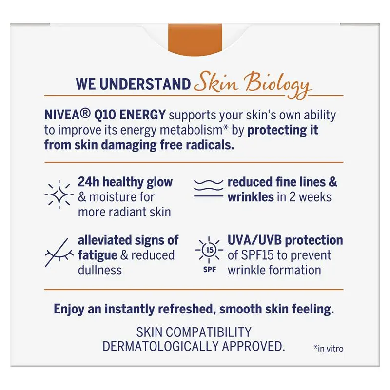 NIVEA Q10 Energy Anti-Wrinkle Day Cream SPF15 is an advanced anti-wrinkle day cream that provides tired skin with a new burst of energy and let’s your skin cells take up to 50% more oxygen. The lightweight and intensely moisturising formula combines the power of Q10 and highly effective pure vitamin C, which is completely absorbed into your skin to fight fine lines. With SPF 15 and UVA/UVB protection to help protect the skin against sun-induced wrinkle formation and premature skin ageing, you can feel dull and tired skin recharging. The formula immediately invigorates the skin and moisturises intensely for greater freshness and visibly smoother skin. The skin compatibility of this energising day cream has been dermatologically approved.