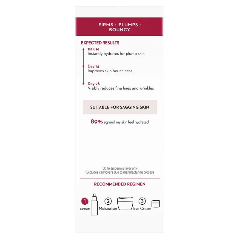 • Instantly plumps, visibly firms and smoothens fine lines with Collagen Peptide + Niacinamide that deeply penetrates into skin.