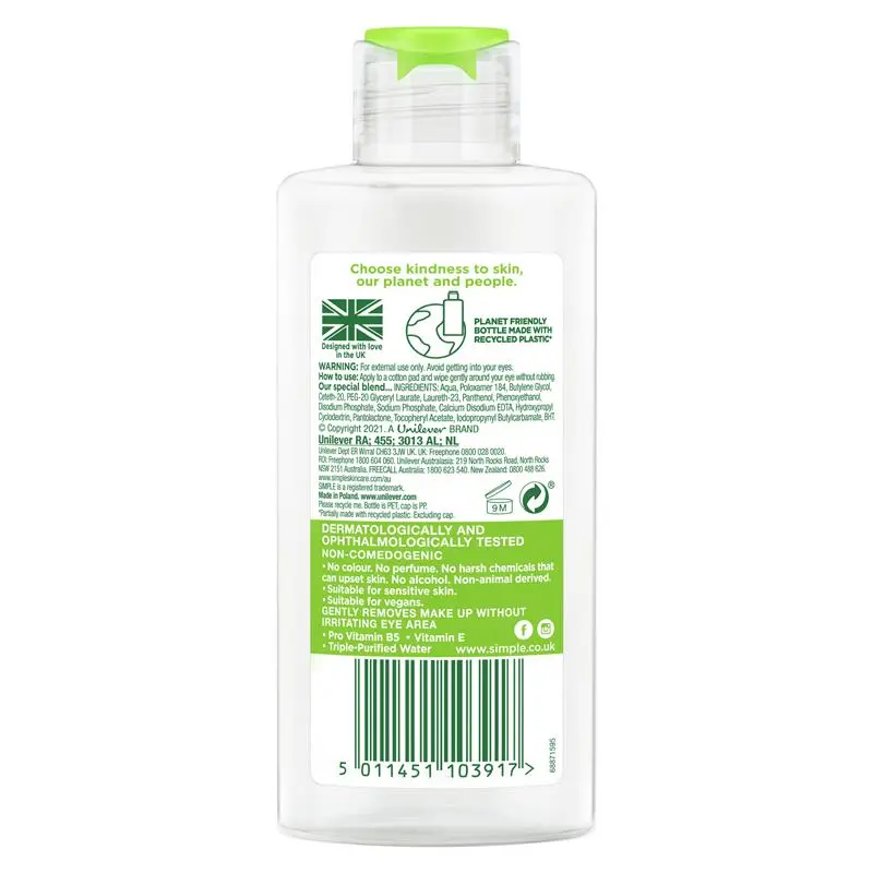 Eyes are particularly sensitive and they need extra care. Simple Conditioning Eye Make-up remover, removes all eye make-up even waterproof mascara without stinging or irritating the eyes. Our 100% oil free formula includes a special blend of Simple cleansing goodness containing Pro-Vitamin B5 that helps to gently remove even waterproof mascara while restoring, softening and smoothing skin. This dermatologically tested and approved Eye Make-up remover contains no perfume, no colour, no oil and no unnecessary ingredients so it won’t upset your skin making it perfect for even sensitive skin. For best results: Apply to cotton wool and wipe gently around the eye area without rubbing. Follow by cleansing with our Kind To Skin Moisturising Facial Wash. Simple have been the experts in sensitive skin since launching the first perfume and colour-free soap in 1960. We’ve stayed committed to our original philosophy of creating skincare products suitable for all skin types and as our product range has grown. For over 50 years, we’ve pioneered a kinder approach to skin. In fact, it’s become something of an obsession. Over time we’ve really got to understand skin; what it does and the everyday challenges it faces. We’ve learnt that when something is as delicate and precious as skin, it deserves only the kindest care. For more information visit: http://www.simpleskincare.com.au