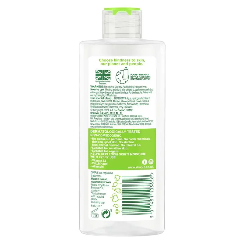 Simple Soothing Skin Toner removes the last traces of make-up and cleanser and helps to clarify and refresh your skin, preparing the way for perfect moisturising. A special blend of Simple skin toning goodness containing Pro-Vitamin B5, Chamomile, Witch Hazel and Allantoin, helps to keep your skin toned and refreshed. This dermatologically tested and approved toner contains no perfume, no colour and no unnecessary ingredients so it won’t upset your skin. Perfect for even sensitive skin. For best results: Apply generously to cotton wool and wipe in gentle upward movements over skin morning and night. Follow with any one of Simple’s everyday moisturisers. Simple have been the experts in sensitive skin since launching the first perfume and colour-free soap in 1960. We’ve stayed committed to our original philosophy of creating skincare products suitable for all skin types and as our product range has grown. For over 50 years, we’ve pioneered a kinder approach to skin. In fact, it’s become something of an obsession. Over time we’ve really got to understand skin; what it does and the everyday challenges it faces. We’ve learnt that when something is as delicate and precious as skin, it deserves only the kindest care. For more information visit: http://www.simpleskincare.com.au
